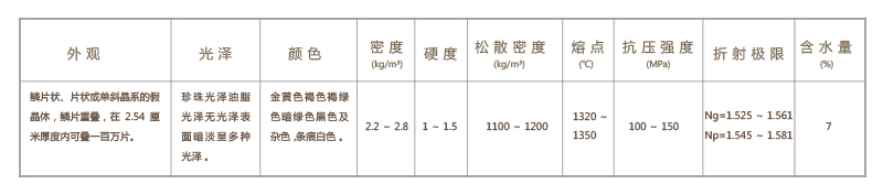 蛭石具有隔熱、耐凍、防火、吸水、吸聲等性能,在800~1000℃下焙燒0.5~1.0分鐘,體積可速增大8~15蓓,可達(dá)30蓓。顏色變?yōu)榻瘘S或銀白色,生成一種質(zhì)地疏松的膨脹蛭石,但不耐酸,其介電特性也較差。